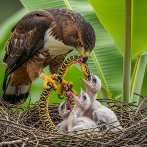 A magnificent Ornate Hawk-Eagle (or large Falcon) stands proudly on its stick-built nest, gripping a yellow-and-black patterned snake in its talons. With incredible tenderness and precision, the…